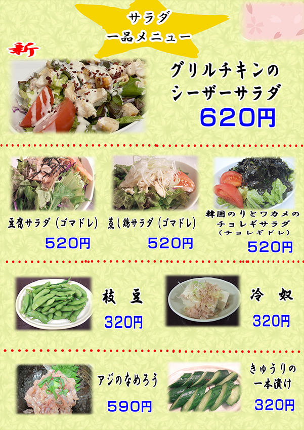 | 軟骨の唐揚げ | ¥540 | サラダ各種 | ¥520~ |
