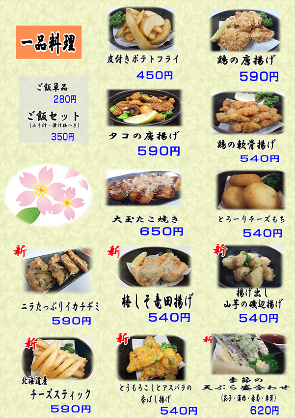 | 鶏の唐揚げ | ¥590 | ポテトフライ | ¥450 |