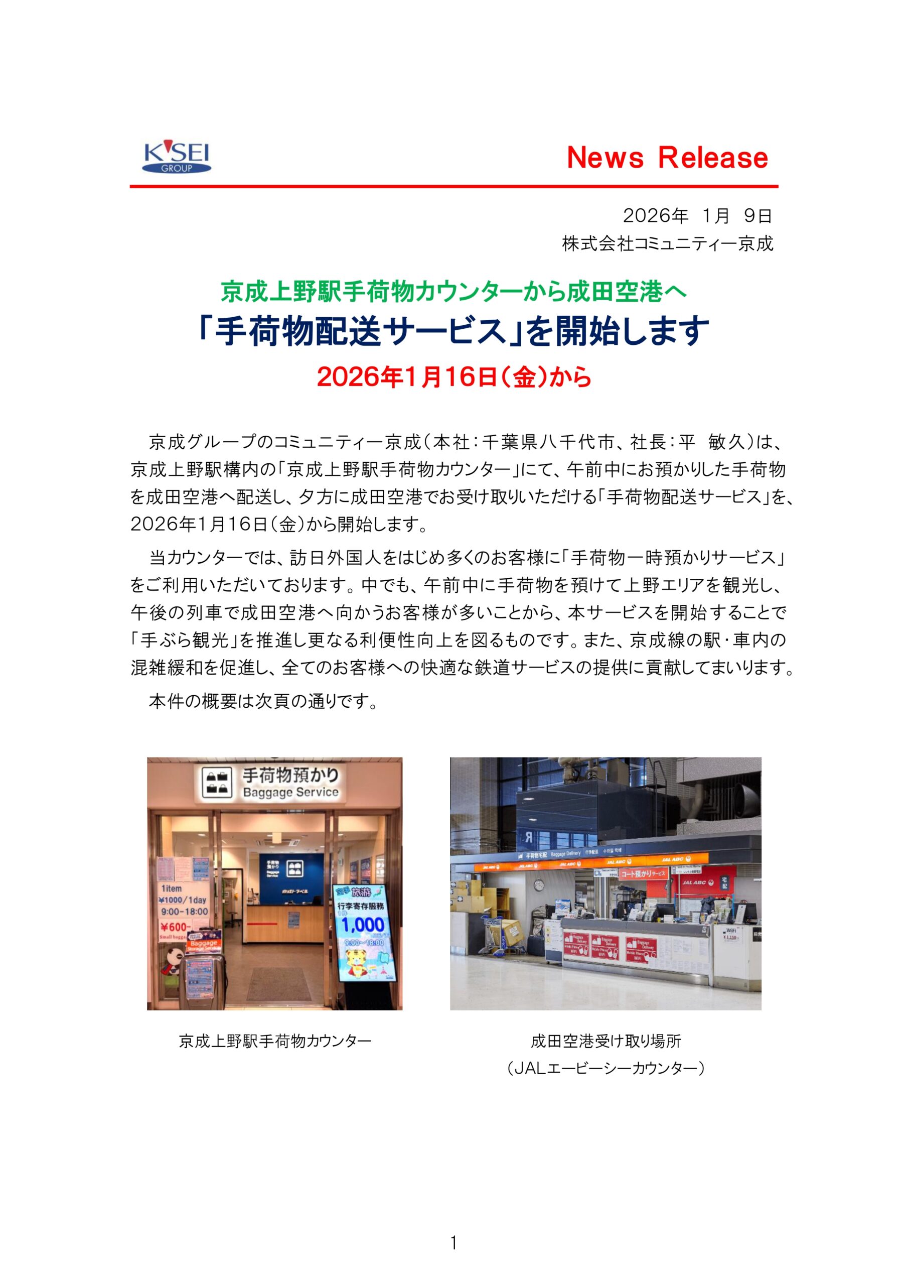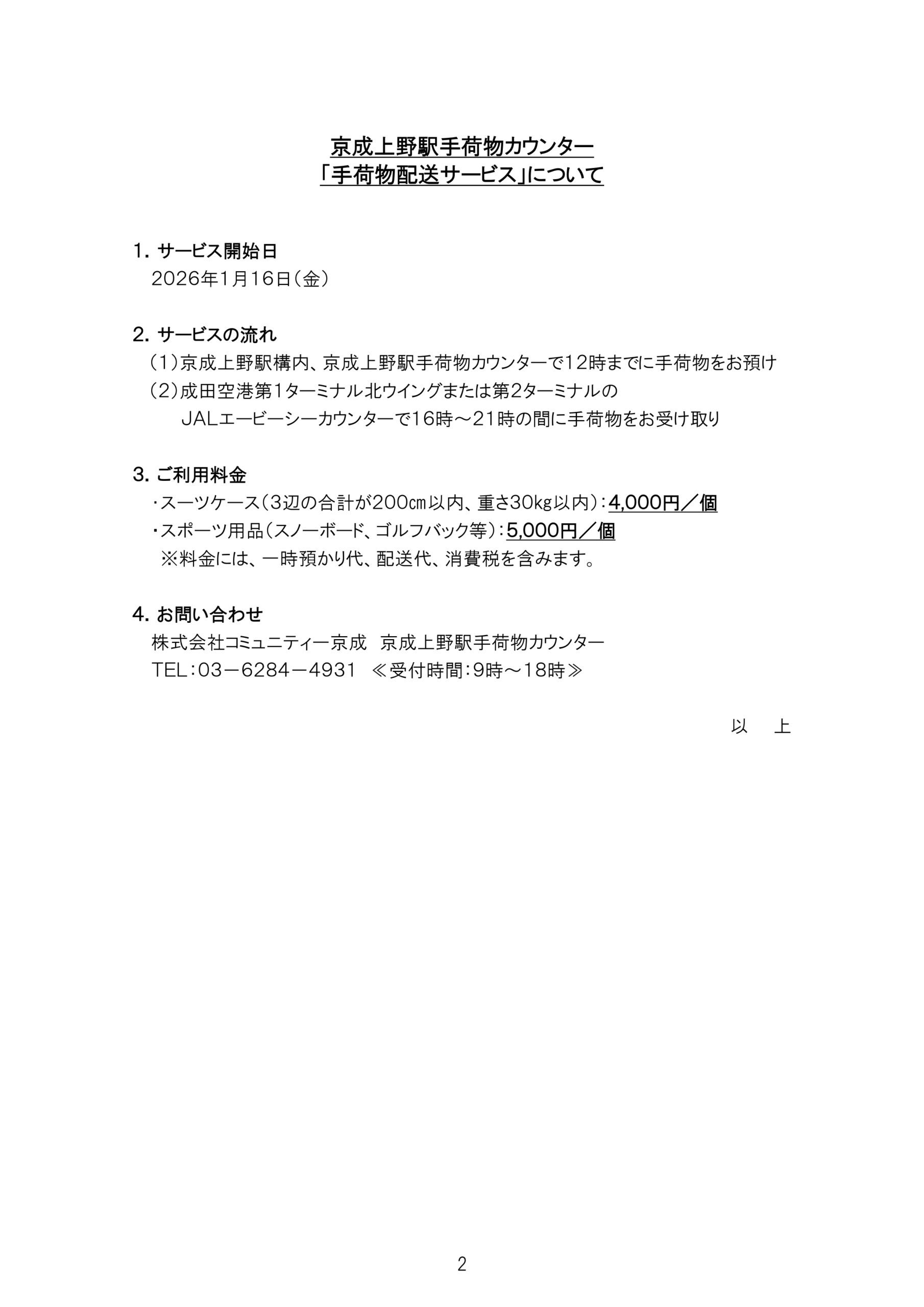 - 京成上野駅手荷物カウンターから成田空港へ「手荷物配送サービス」を開始します2026年1月16日(金)から