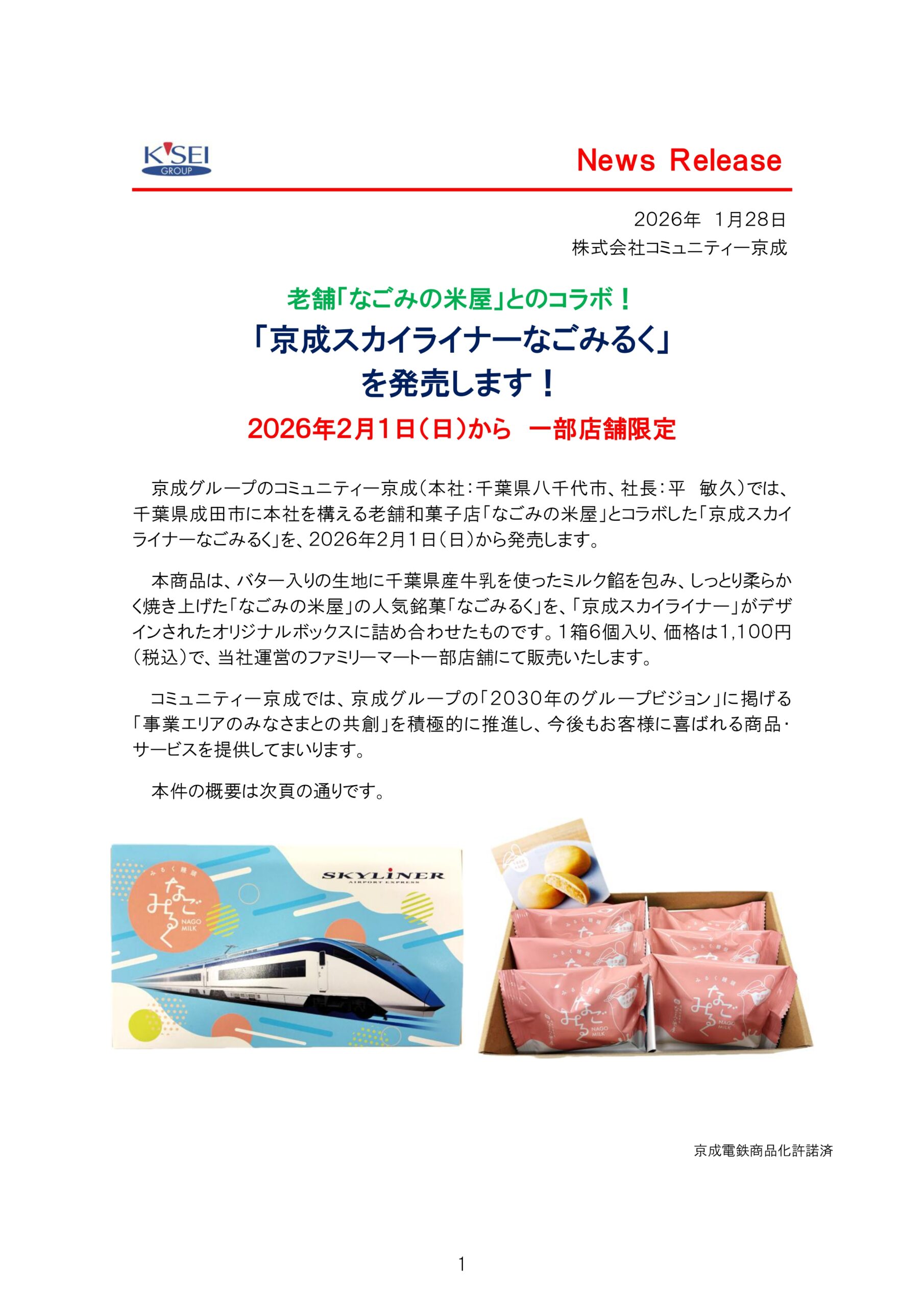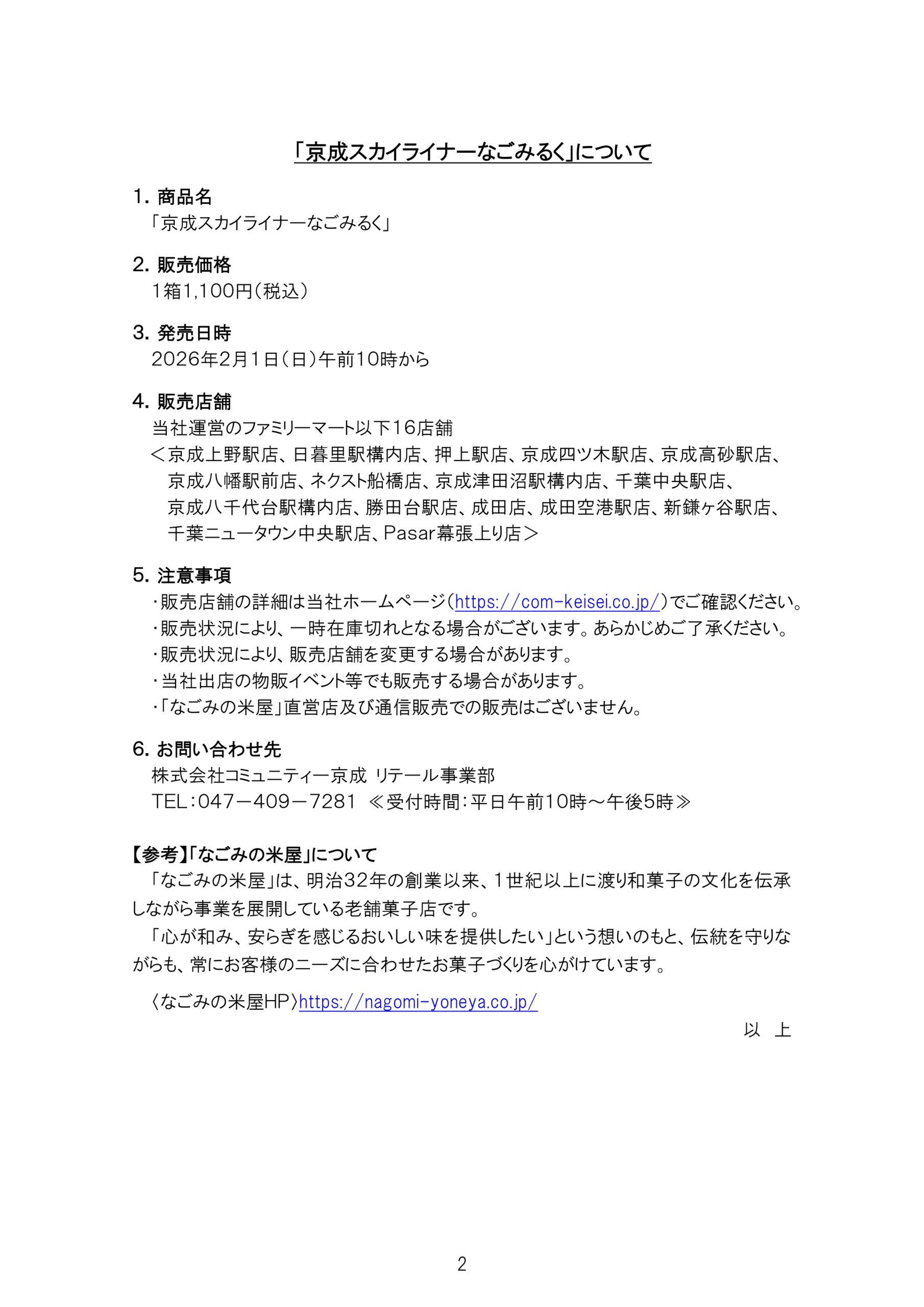 - 老舗「なごみの米屋」とのコラボ!「京成スカイライナーなごみるく」 を発売します!2026年2月1日(日)から 一部店舗限定